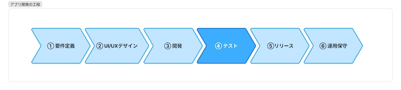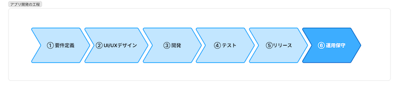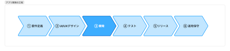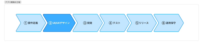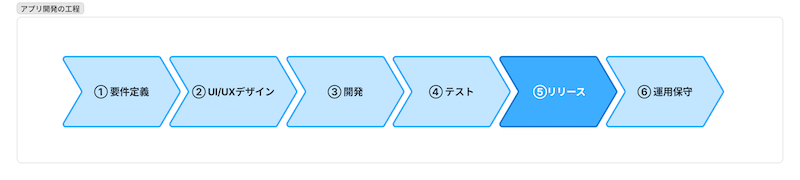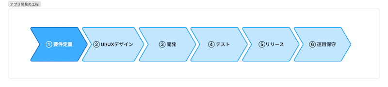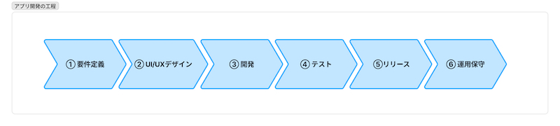 アプリ開発は一般的に「要件定義」→「UI/UXデザイン」→「開発」→「テスト」→「リリース」→「運用保守」という流れで進みます。