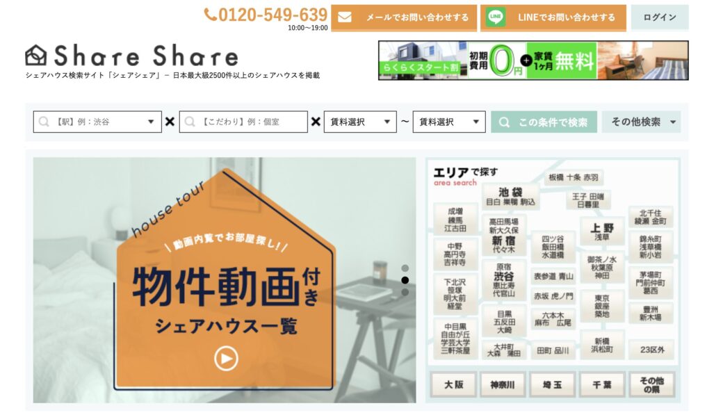 「シェアシェア」は、日本最大級のシェアハウス物件検索ポータルサイトで、全国のシェアハウスやゲストハウスの物件情報を豊富に掲載しています。